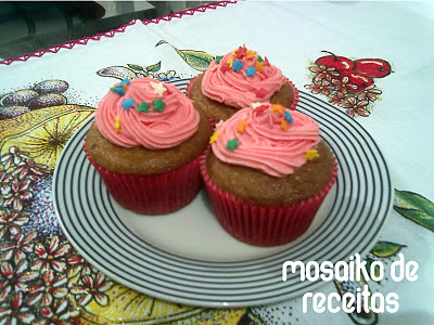 Casa cheia de gente, bagunça na cozinha nos preparativos do aniversário do meu padrasto e eu invento de fazer cupcakes pra desespero da minha mãe rsrs. Sorte que a receitinha tirada do Amehlia digital é bem fácil e gostosa. A idéia era fazer um bolinho simples, porém estava inspirado e resolvi me arriscar numa cobertura buttercream. Tentei fazer esse tipo de cobertura apenas uma vez e tinha sido um desastre, mas animado com a minha coxinha avassaladora, deixei o medo de lado e mão na massa. Bom, minhas impressões: achei a cobertura gostosa, não é gordurosa como pensei que seria, porém também imaginava algo mais incrível. Não me decepcionou no geral, achei um pouquinho doce demais, mas em contraste com o sabor delicado do bolinho ficou bem equilibrada. Como primeira tentativa achei ótima.