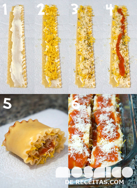 Cozinhe a massa em água quente até ficar al dente (Não pode ficar muito cozida). Passe pela água fria e reserve. Faça a montagem como na foto: 1 Passe uma camada de requeijão, 2 espalhe o frango desfiado, 3 o queijo parmesão, salpique um pouco de orégano e 4 molho de tomate. 5 Feche formando um mini rocambole. Espalhe um pouco de molho em um refratário, coloque os rolinhos com cuidado, cubra com mais molho e queijo parmesão ralado. Leve ao forno 180/200º por 15 a 20 minutos ou até gratinar.