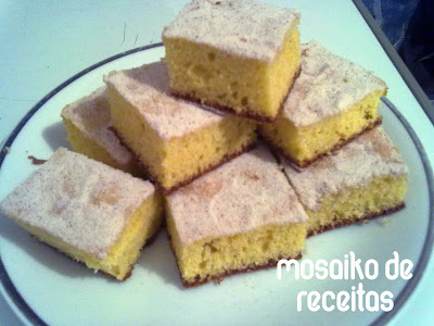 Quando a massa esfriar bem (uns 15 min), acrescente as gemas uma a uma batendo bem. Junte o fermento e acrescente as claras batidas em neve com cuidado. Leve para assar em fôrma untada com manteiga e fubá, forno pré-aquecido, 180/200º por 40 min +ou-, até estar corado e crescido. Após esfriar polvilhe com o açúcar e a canela misturados, corte em quadrados e sirva.