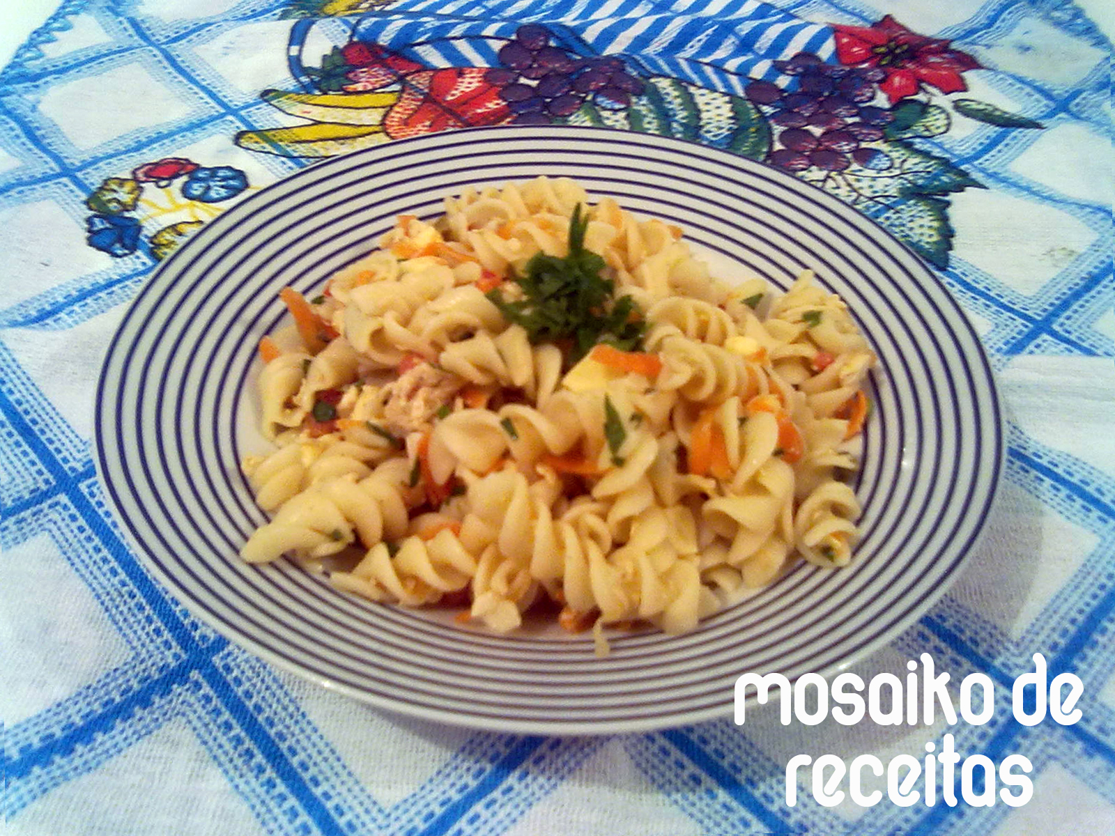 Como é bom chegar em casa direto do trabalho (apesar do trânsito né). Férias da faculdade é tudo de bom, se bem que já ta me dando uma saudadinha dos amigos, das aulas, e esse 5º semestre promete rsrs. Aproveitando que cheguei em casa inspirado e minha mãe olhou com aquela cara de tipo, “não tem janta”, me animei e fui direto ver o que tinha na dispensa pra inventar algo gostoso. Decidi por fazer uma salada de macarrão bem refrescante com as sobras de algumas coisinhas da geladeira. Minha mãe aprovou tanto que já me convocou pra repetir a receita domingo no almoço de aniversário do meu padrasto. O legal da receita é que você pode acrescentar tudo o que você tiver de gostoso: abobrinha, sobras de frango assado, brócolis, presunto em cubinhos e o que mais tiver de bobeira na sua geladeira, é uma ótima forma de aproveitar essas sobrinhas.