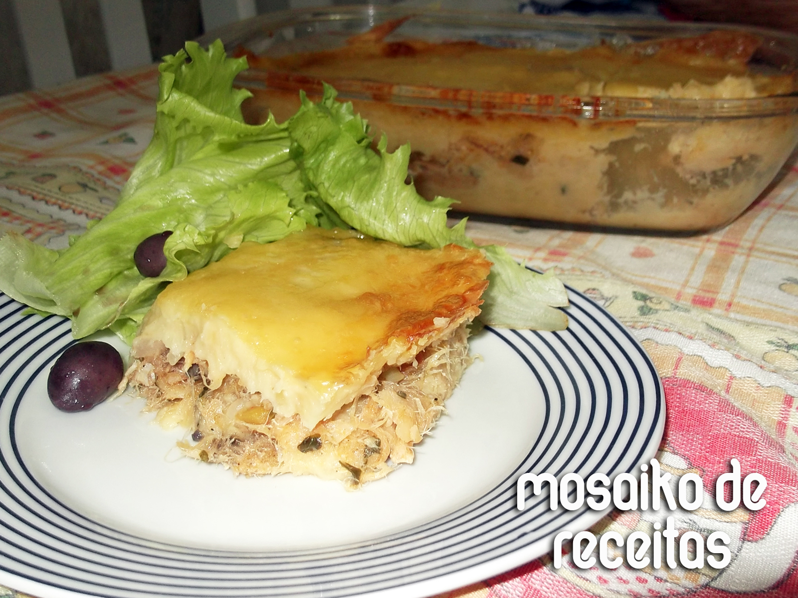 Montagem: Coloque metade do purê num refratário, o recheio de bacalhau e metade das fatias de mussarela. Cubra com o restante do purê e por cima, as fatias de mussarela restantes. Salpique queijo ralado se desejar e leve ao forno por cerca de 30 minutos até corar bem em cima. Sirva com arroz branco e uma saladinha leve de folhas.