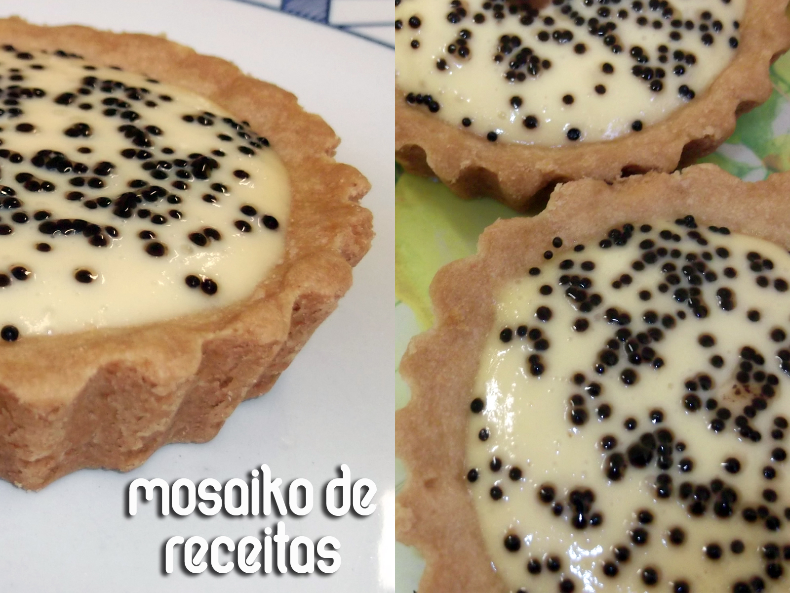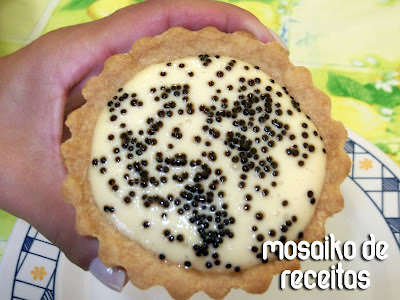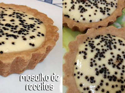 Pulo do gato: Na foto, os pontinhos pretos ficaram lindos né? São confeitinhos de chocolate estilo bolinhas. Deram um acabamento perfeito de sementinhas não deram? Até pode ser feito com chocolate granulado mas acho que não ficaria tão lindinho. Outra dica é colocar sementinhas de maracujá mesmo. Misture a polpa de 1 maracujá com 3 colheres de água e 2 de açúcar e leve ao fogo até ferver. Deixe esfriar e espalhe por cima das tortinhas. Eu coloco essa cobertura quando faço uma torta grande, fica linda também e bem azedinha.