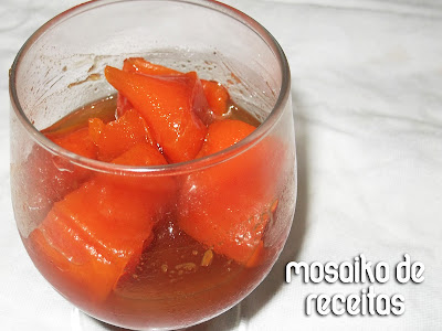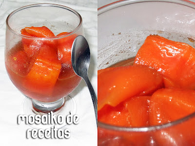 Esse doce de abóbora em pedaços é comfort food total pra mim! Minha mãe fazia uma panelada enoooooorme desse doce que eu devorava praticamente sozinha! Pra ter idéia, ela deixava as abóboras de molho no cal dentro do tanque!!! rss