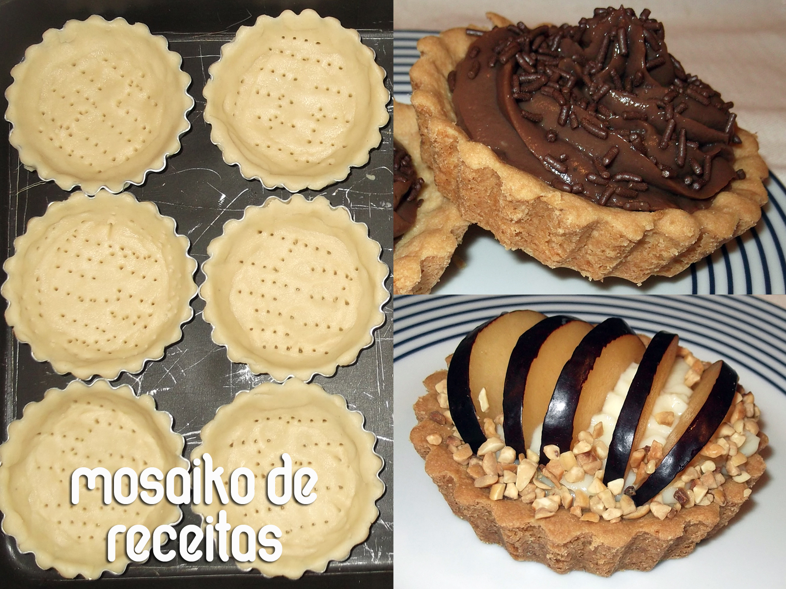Massa: Misture a farinha de trigo e o açúcar. Junte a manteiga em temperatura ambiente e trabalhe a massa até ficar homogênea. Embrulhe em plástico filme e deixe na geladeira por 30 minutos. Forre o fundo e as laterais de 12 forminhas canelas de fundo falso, fure com um garfo para não crescer. Leve ao forno pré-aquecido 180/200° por 30 minutos até corar. Reserve.
