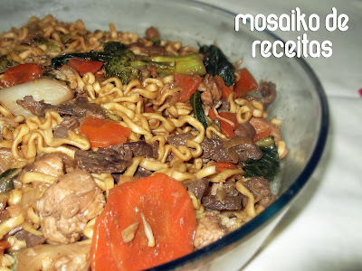Corte a cenoura em lâminas, o brócolis e a couve-flor em buquezinhos pequenos, a cebola em pedaços grandes e os legumes que você usar em tamanhos pequenos também. Em uma panela bem grande e alta refogue as carnes em um pouquinho de óleo até fritar bem. Acrescente a cenoura, couve-flor e o brócolis, um pouco de shoyo e deixe cozinhar por uns 10 minutos. Coloque o restante dos legumes, mais shoyo, tampe a panela e deixe cozinhar mexendo de vez em quando até reduzir o volume dos legumes e eles estarem cozidos porém ainda durinhos. Acerte o sal caso seja necessário. Você vai perceber que juntará bastante caldo no decorrer da receita. Dissolva o amido de milho em um pouquinho de água, jogue no molho e mexa até o caldo engrossar levemente. Junte o macarrão escorrido, misture bem e pronto.