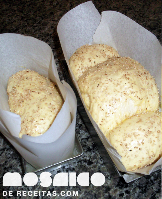 Modele o pão e coloque numa fôrma de pão untada e forrada nas laterais com papel manteiga com uns 15 cm de altura para fora. Pincele a superfície com a gema, salpique gergelim e deixe crescer por mais 40 minutos. Leve ao forno preaquecido a 180º por cerca de 30 minutos. Desenforme e deixe descansar sobre uma grade.