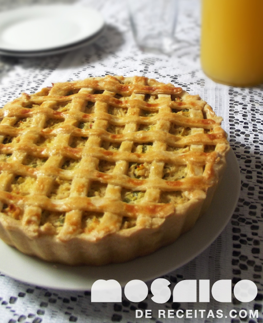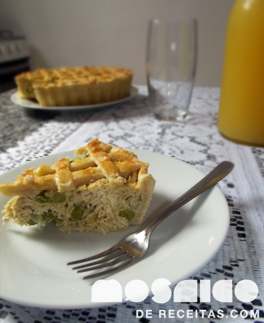 Montagem: Separe 1/3 da massa e com o restante forre o fundo e as laterais de uma fôrma de fundo removível. Coloque o recheio de frango frio por cima. Abra o restante da massa bem fina e corte em tiras de 1 cm. Sobreponha as tiras até formar um quadriculado em cima da torta. Pincele a gema e leve ao forno preaquecido 210º por 40 minutos ou até corar bem. Sirva morninha.
