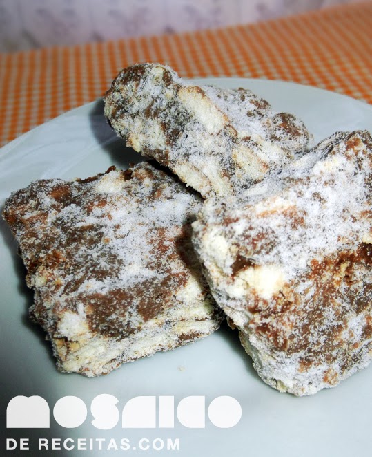 Leve ao fogo o leite condensado, chocolate em pó e a manteiga ou margarina mexendo sempre até desgrudar do fundo da panela. Desligue o fogo, acrescente os biscoitos e coloque numa fôrma untada levemente com óleo espalhando bem. Deixe esfriar, corte em quadrados e passe no açúcar.
