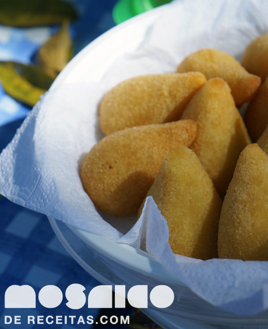Que brasileiro resiste a uma coxinha fresquinha, crocante e quentinha? Por isso este salgado faz tanto sucesso com os gringos. Aqui em casa adoramos e qualquer motivo é pretexto de experimentar uma nova receita desta delícia. Elas já apareceram no blog em versão tradicional de frango e com massa de mandioquinha e carne louca. Resolvi testar uma versão com massa de milho, para aproveitar o clima junino do mês. O resultado ficou bem evidente pelas fotos não é? Massa delíciosa, recheio cremoso *_*. Uma tentação a cada mordida.