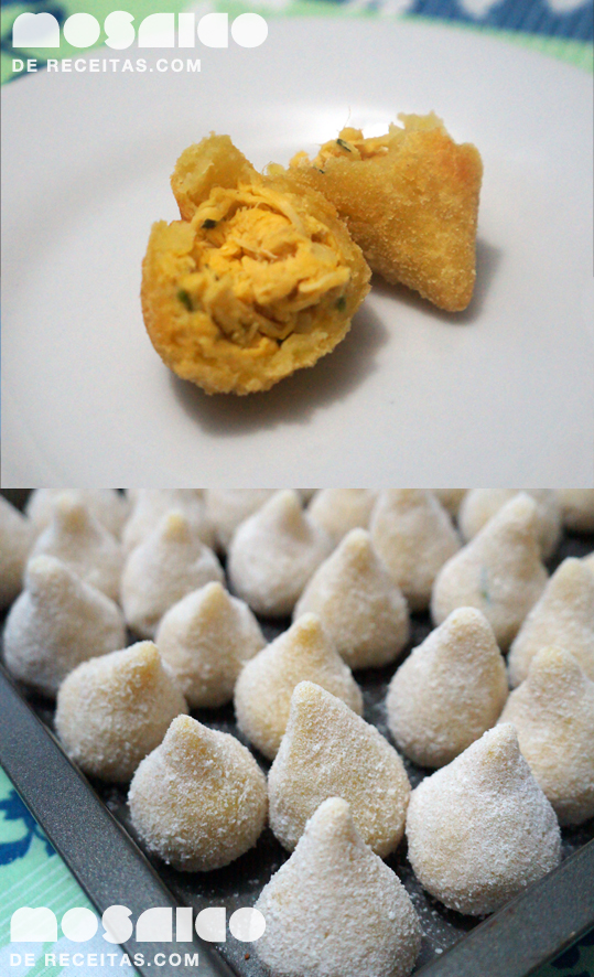 Montagem: Recheie porções de massa com uma colher de frango moldando como uma coxinha. Mergulhe rapidamente pela água gelada e em seguida passe na farinha de rosca. Frite em óleo quente, aos poucos, até dourar.