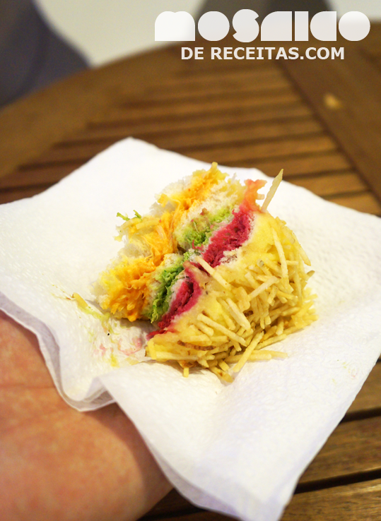 Montagem: Forre uma fôrma de 20cm de fundo falso com plástico filme, deixe sobrar bastante nas bordas. Cubra o fundo com uma camada de fatias de pão de fôrma. Corte em pedaços para tapar todos os buracos. Coloque um dos recheios coloridos. Continue assim sucessivamente até terminar com uma última camada de pão, alternando os recheios coloridos. Aperte bem entre cada camada para compactar o bolo. Dobre o plástico filme por cima da fôrma e leve ao congelador por pelo menos uma hora. Desenforme o bolo com cuidado diretamente no prato de servir. Cubra com o purê de batatas e mandioquinha, alisando bem (uma colher molhada ajuda). Pouco antes de servir, cubra o bolo todo com a batata palha.