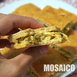 Recheio: Refogue a cebola, o alho e o pimentão no azeite até murchar levemente. Junte o frango e os temperos e deixe ferver, mexendo de vez em quando. Acrescente o tomate e o cheiro-verde só no final. Use o caldo do frango para que o recheio não fique seco. Deixe esfriar.