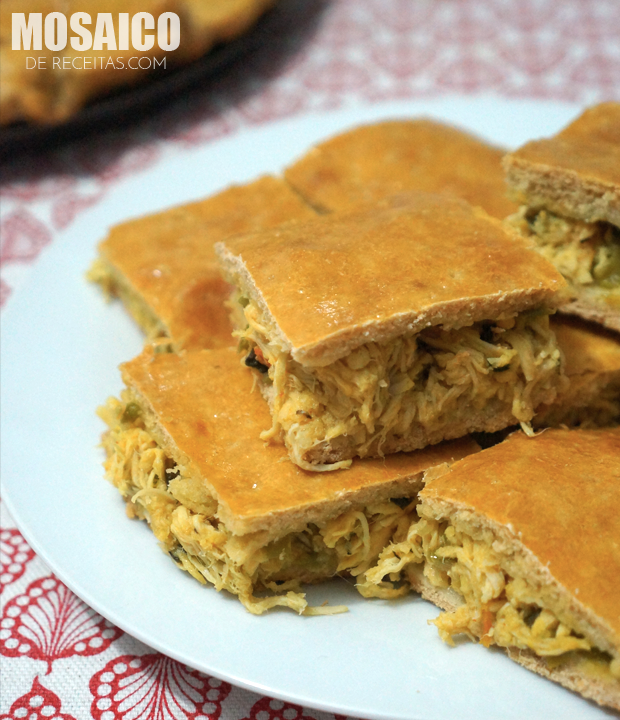 Montagem: Abra a massa com um rolo até ficar bem fininha (1/2 cm) e coloque sobre uma fôrma untada com azeite. Espalhe o recheio e cubra com a outra parte. Feche bem as bordas e faça alguns furos sobre a massa com um garfo, para que o recheio possa respirar. Leve ao forno preaquecido 200° por 40 minutos, ou até dourar.