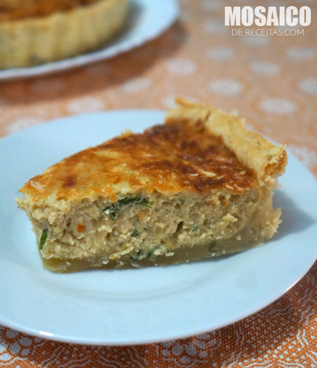 Massa: Misture todos os ingredientes, acrescentando a água aos poucos, até formar uma bola. Embrulhe em plástico filme e leve à geladeira por pelo menos 1/2 hora. Abra com um rolo em uma espessura de 1/2 cm e forre o fundo e as laterais de uma fôrma de 23cm de diâmetro. Fure a massa com o garfo e reserve na geladeira.
